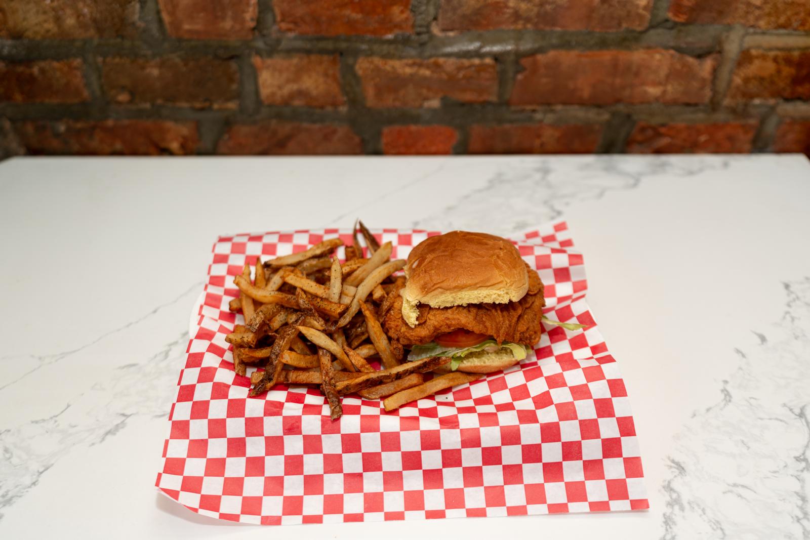 Crispy, golden whiting stacked on soft bread, served with seasoned fries and your choice of drink to cool it down right.
